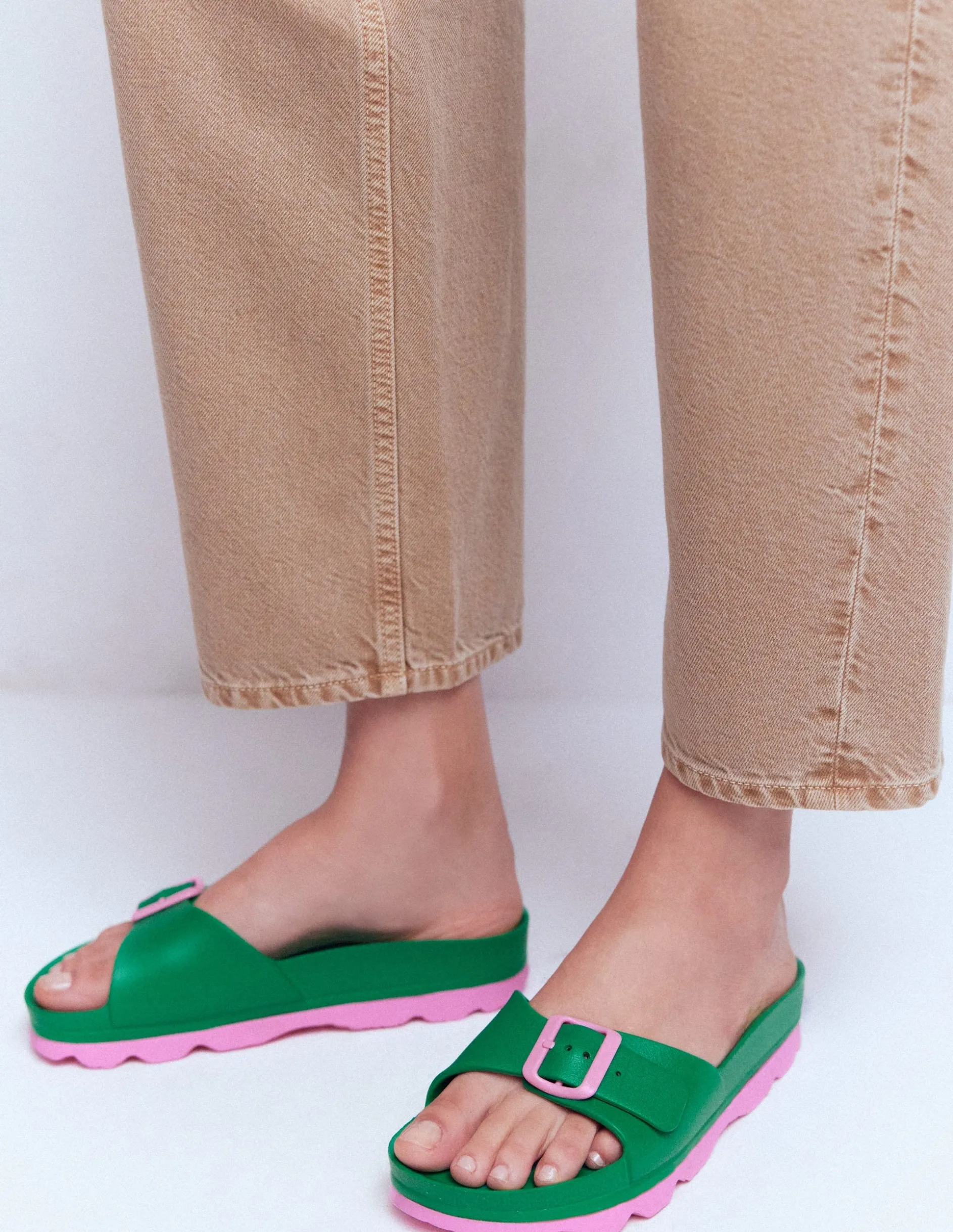 Pour créer ces claquettes faciles à vire, nous avons fait appel à quelques-unes de nos associations de couleurs préférées. Et cette boucle contrastante assortie à la semelle épaisse ? Sublime !
