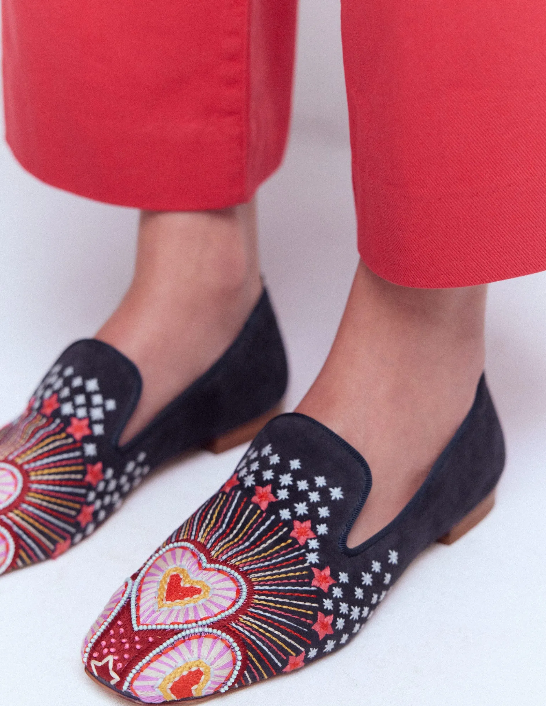 – Dessus daim, Chaussette et doublure cuir, Semelle fabriqué par l’homme, Broderie textile