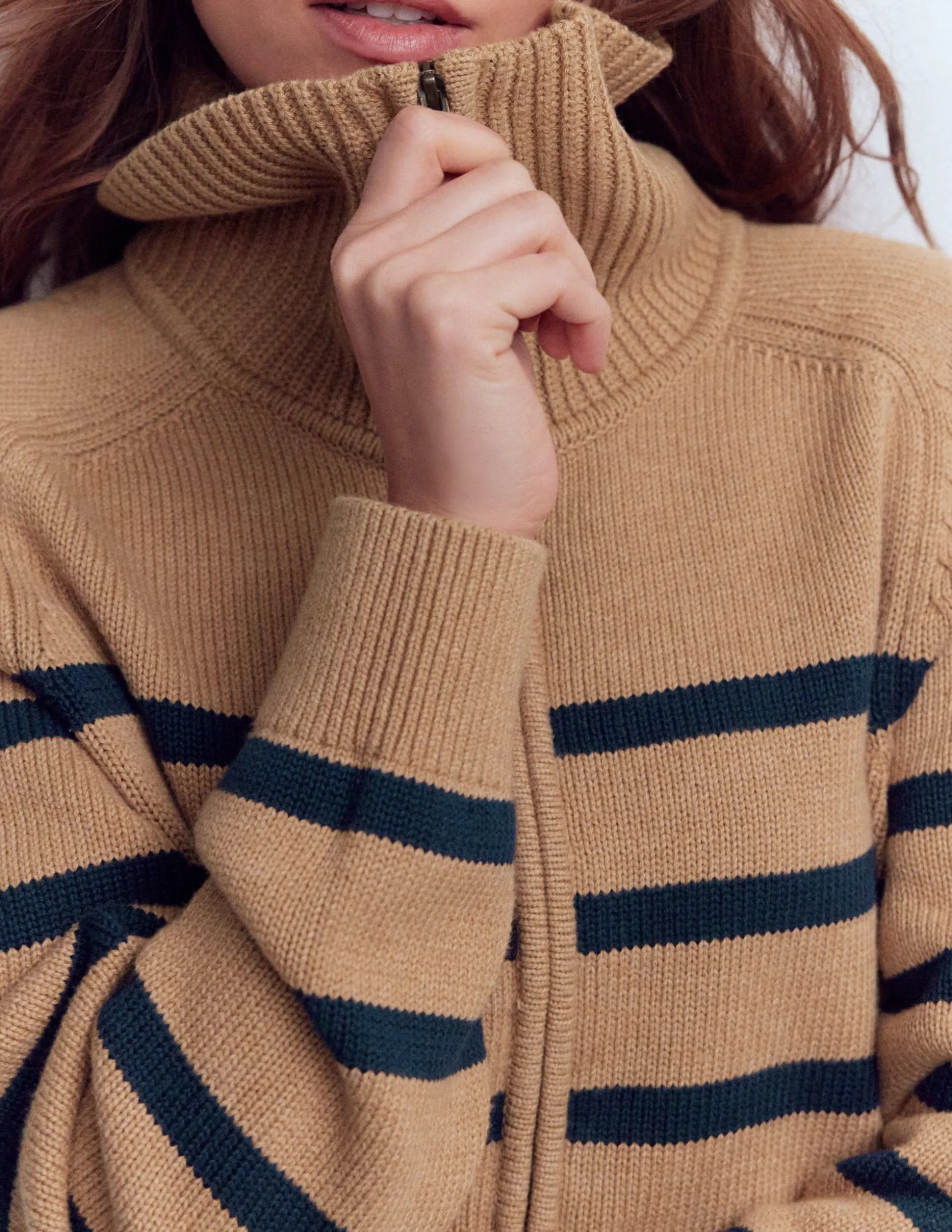 | Color | Camel chiné, rayures bleu marine |