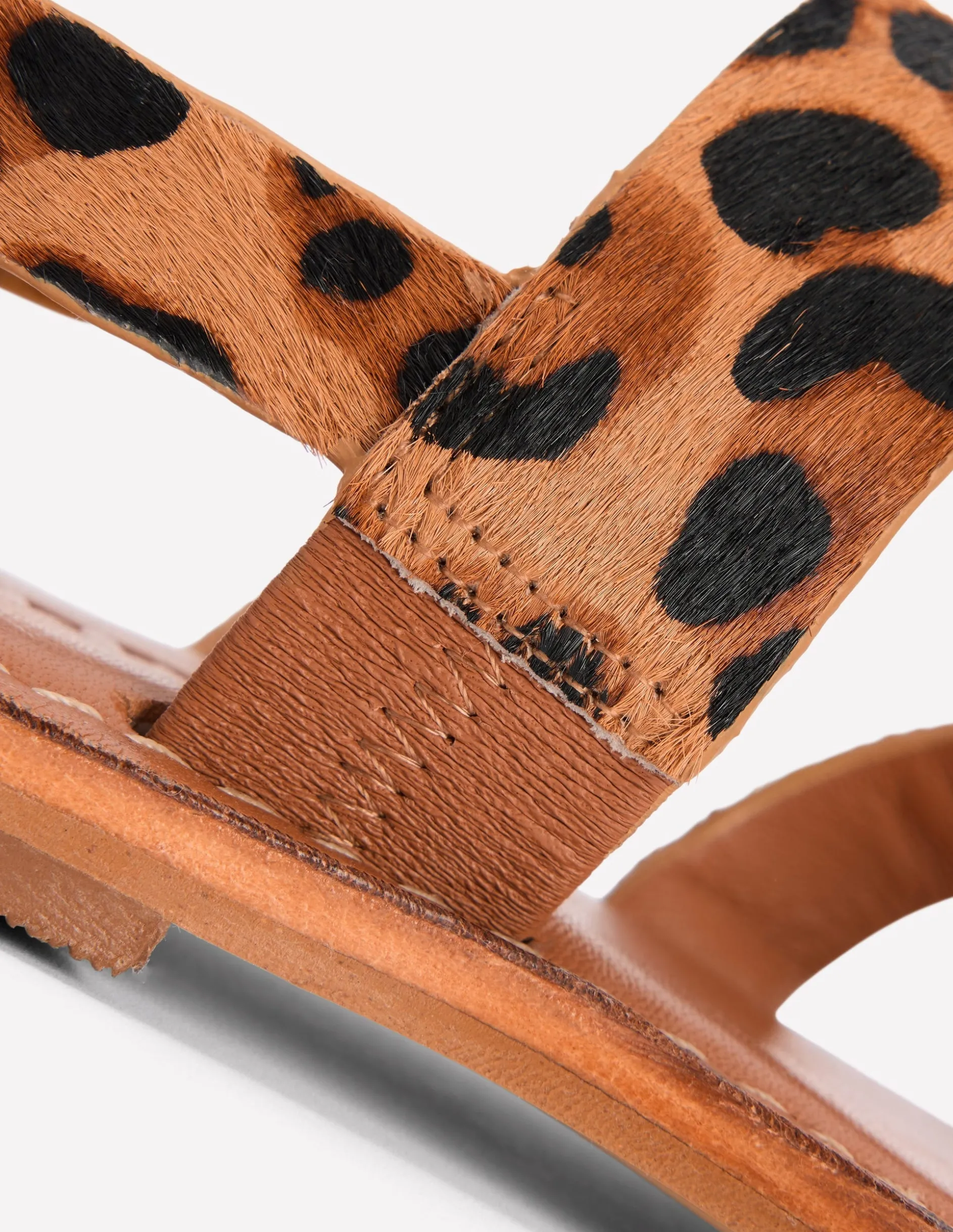 – Dessus poils sur peau de vache, Chaussette et doublure cuir, Semelle fabriqué par l’homme